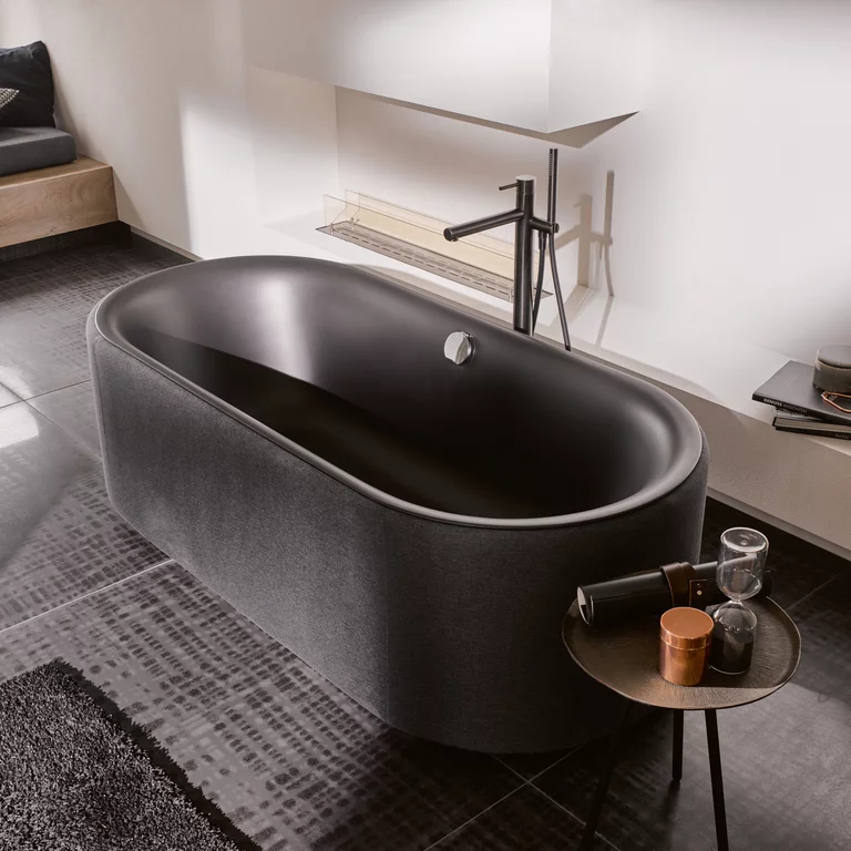 BetteLux Oval Couture brings warm, homely comfort into the bathroom. The outside is upholstered and covered in woven fabric like a welcoming sofa, and radiates an atmosphere that is as sensuous as it is relaxed. The feel, texture and colour of the waterproof functional fabric emotionalise the bath, removing its strict functional character. The upholstery also absorbs sounds, which improves the acoustics in the room. With all the home comfort of a living room.