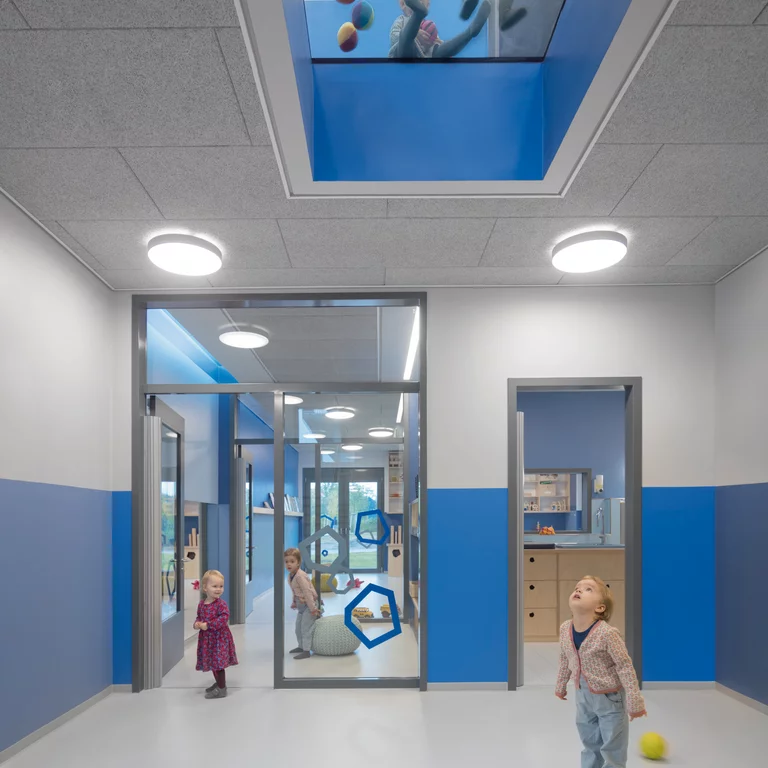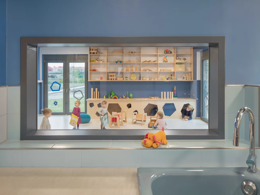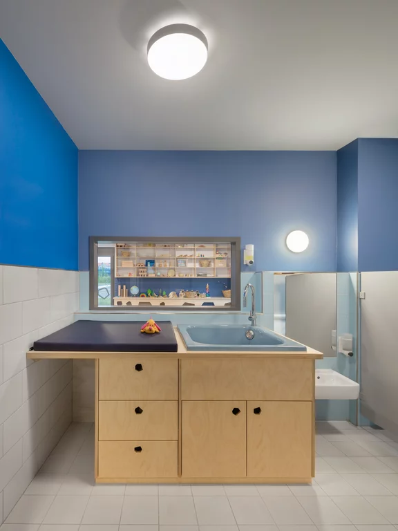 In the design of the three sanitary and changing rooms, the architects made it the main priority to have plenty of natural light and aesthetically pleasing bathroom elements. "It should be a place of enjoyment, and somewhere where children like to be. Washing, baby-changing and everything relating to the topic of water needs to be viewed playfully here, and the blue colour – which matches the overall colour concept of the facility – helps here," explains Danziger. For instance, there are windows in the walls over the baby-changing stations so the children always know where they are and continue to feel connected to the rest of the group.