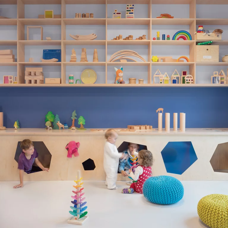 The interior design is also bursting with colour. "In my projects, I always work intensively with colour," explains architect Jason Danziger. NCS colour range R90B consisting of various shades of blue was used for the "Kita am Gleis". Using only a single range of colours encourages spatial coherence, and has a calming effect on the children. "All of the colours in the project are based on this range of grey-blue colours. Children introduce other colours into the overall concept with the clothes they wear and the toys they play with," he explains.