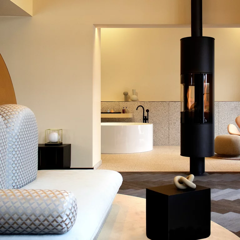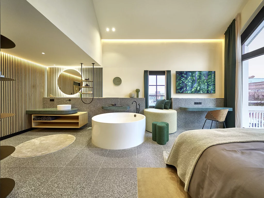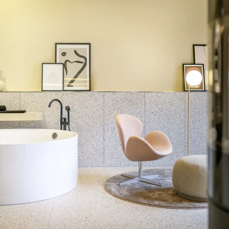 The Eatrenalin Suites at Krønasår are a spectacular addition to the theme park's offerings. These suites offer a unique and exciting experience for guests seeking thrills and luxury. The suites are equipped with state-of-the-art technology and unique design elements and offer breathtaking views of Europapark. The futuristic and spherical interior design is supported by our freestanding baths models BetteEve Oval Silhouette and BettePond Silhouette.