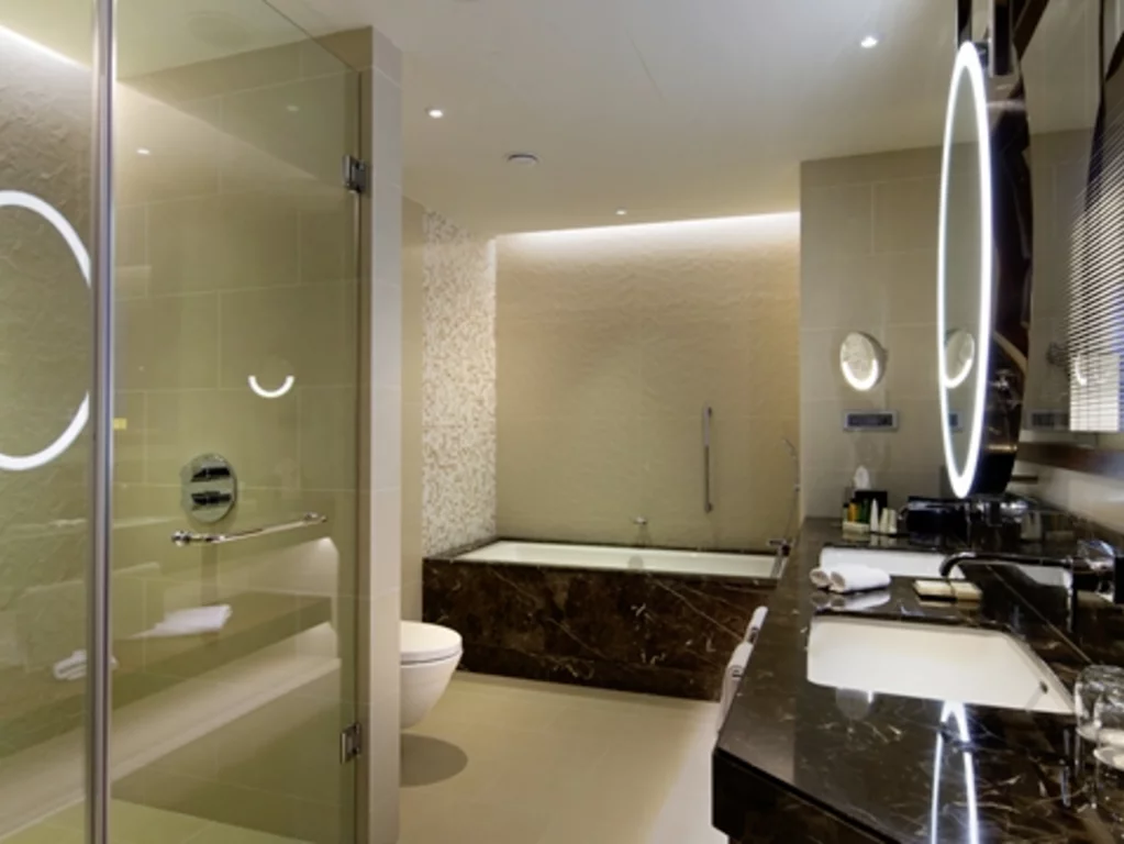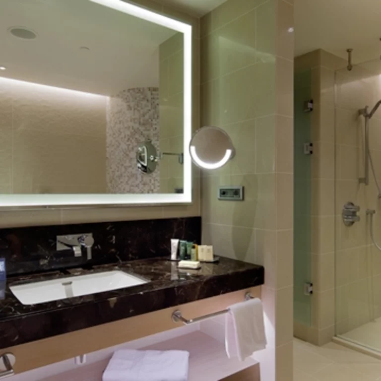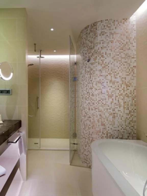 The Hilton Hotel in Batumi is a luxurious 5-star hotel with modern design and first-class amenities. The bathrooms in the rooms are elegantly designed and equipped with high-quality materials. Each bathroom has a spacious BetteSupra shower tray with glass wall and rain shower head, as well as a separate BetteOne bath, ideal for relaxing. The design of the bathrooms is modern and simple, with clean lines and neutral colours that create a calming atmosphere.