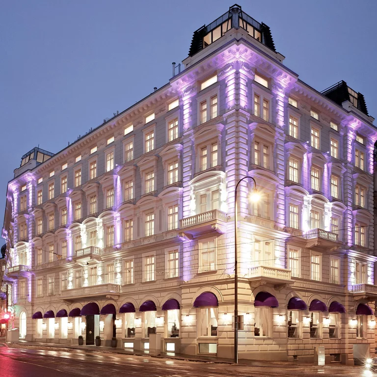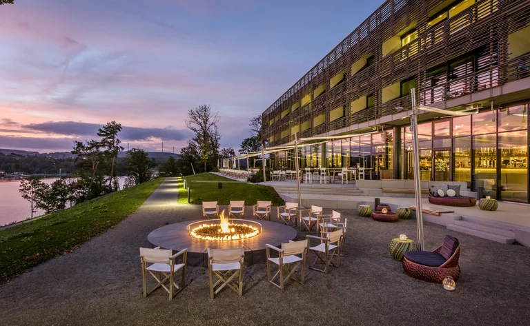 <the Fonteney in Hamburg is a successful experiment in modern organic design. The curved building consists of three circles that merge together to form two courtyards in the middle. The facade is characterised by convex and concave shapes. Throughout the hotel, no two walls are parallel to each other. Inside, the three connected circles form a 27-metre-high glass atrium that serves as a lobby. Floor-to-ceiling window provide light-flooded rooms and suites and spectacular views of the Alster. The 5-star hotel also attached great importance to exclusivity and hand-picked design for the interior. Which is why the architectural offices of Aukett + Hesse chose two baths made of glazed titanium steel by Bette for the natural stone bathrooms – the BetteStarlet Flair Oval fitted bath and the free-standing BetteStarlet Oval Silhouette.