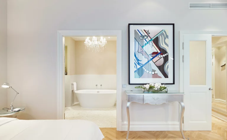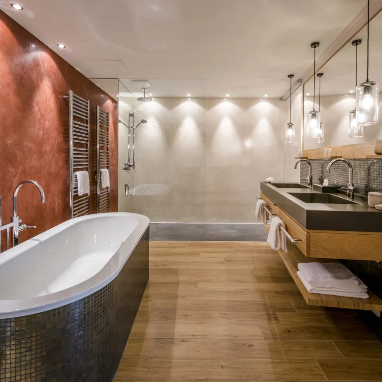 The BetteStarlet Flair Oval was installed under the natural stone so as not to interrupt the consistent use of this material in the bathrooms. The bath and washstand area, floor and walls are made entirely of stone. Every single natural stone slab was individually planned and cut to size. The interior designers opted for the free-standing BetteStarlet Oval Silhouette for many of the rooms and all 17 suites.