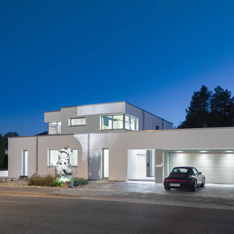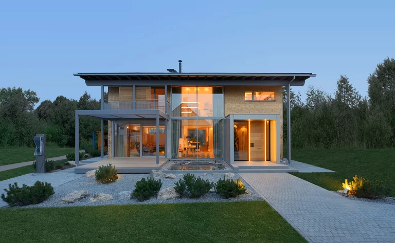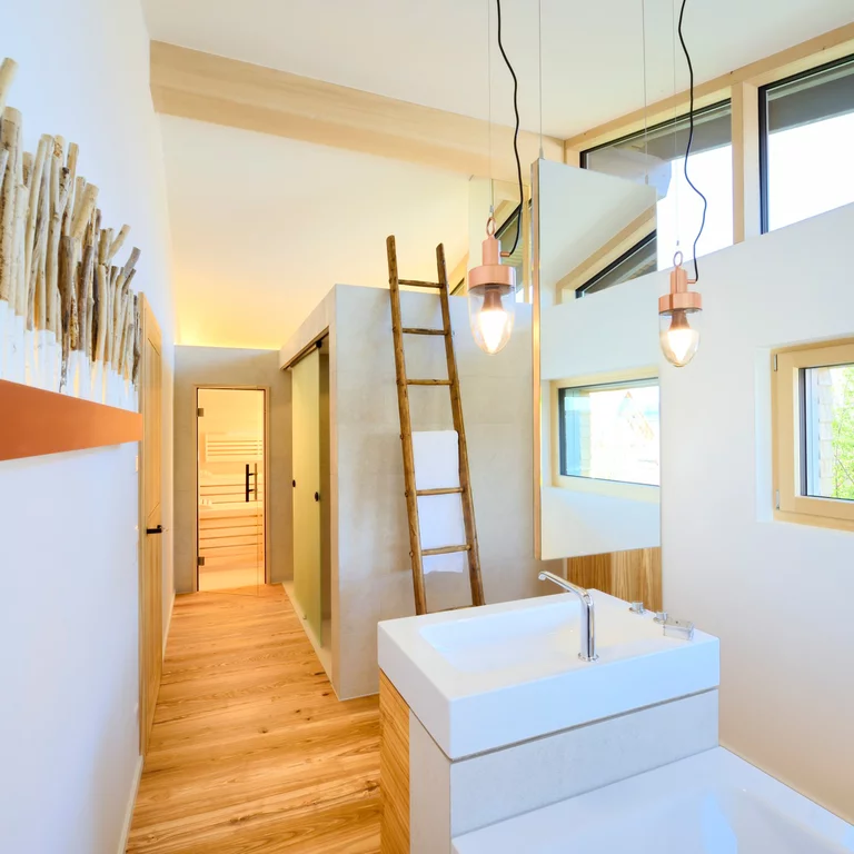 The "Haus am See" is in Langenargen on the waterfront of Lake Constance. It is a show home of the Baufritz company, the specialist in ecological building. Thanks to the almost entirely glazed south side, the building opens up with a large terrace with views of the lake, which creates a unique connection to nature. An intelligent ventilation system automatically supplies fresh air when required. Natural, pollutant-tested materials were chosen throughout the house: rustic oak floorboards with oiled surfaces, polished Jura marble slabs, kitchen surfaces in oak and limestone. The bedroom leads past a room divider of natural tree trunks into the wellness area with a free-standing bath and washbasin made of glazed titanium steel by Bette. Just outside the window: the lake and the Appenzell mountains - pure relaxation.