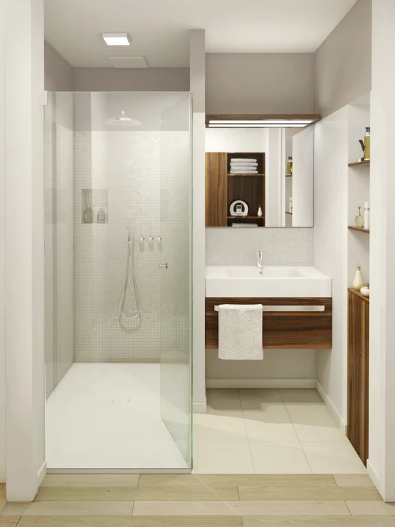 Las viviendas conjugan ventanales panorámicos hasta el suelo con planos cómodos y abiertos. El baño, la cocina y el vestidor están ubicados en un sistema de cubo, y los espacios de almacenamiento de objetos se han externalizado. De este modo, surgen zonas entrelazadas dentro de la vivienda, sin pérdida de espacio habitable. Las duchas a ras del suelo siguen la misma línea. Eso sí: 30 planos de baño diferentes requirieron 30 superficies de ducha de dimensiones diferentes. ¿La solución? Superficies BetteFloor a medida, de acero al titanio vitrificado. Una idea simplemente perfecta, ¿verdad?"