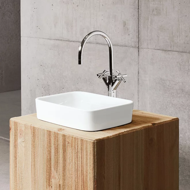 Como regla general, el lavabo debe instalarse a la altura de la mitad del cuerpo; el mueble bajo lavabo queda por debajo, dependiendo del diseño. Esto se aplica tanto a formas como el lavabo rectangular como a las formas ovaladas.