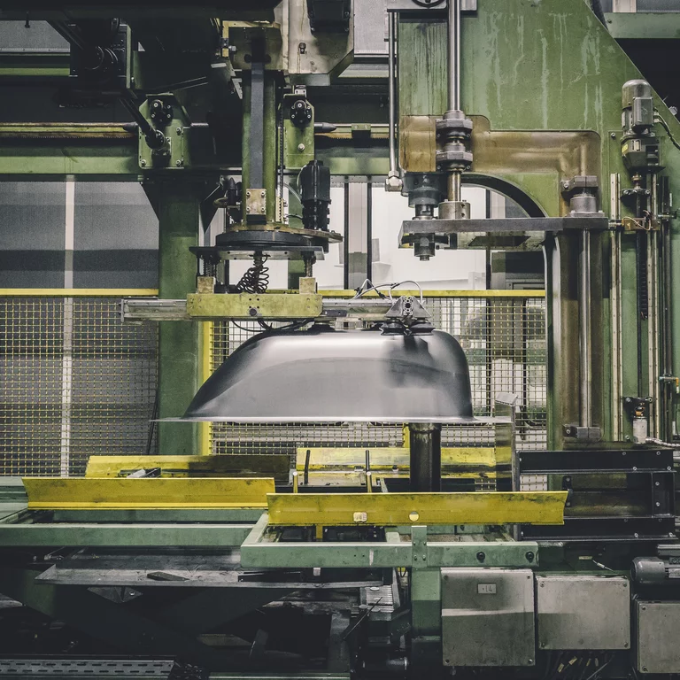 Coopération intelligente des hommes et des machines : notre usine de Delbrück. Près de 390 collègues travaillent ici, dont quelque 160 dédiés à la production de nos éléments de salle de bains de qualité en acier titane vitrifié. Ils utilisent pour cela des presses gigantesques et des robots articulés. Une cadence des plus intenses, le plus souvent avec roulement des équipes.