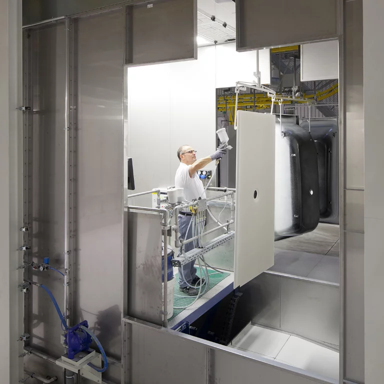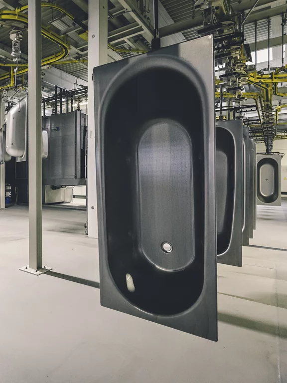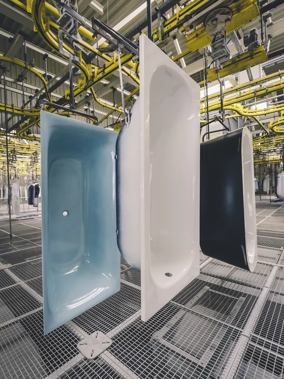 Avec le ballet des robots, des buses pulvérisent des couches d'émail sur les éléments de salle de bains, dans une chorégraphie réglée au cordeau. Dans le cadre d'un processus « mouillé sur mouillé », l'émail de fond est suivi par la couche supérieure et la couche de couleur.