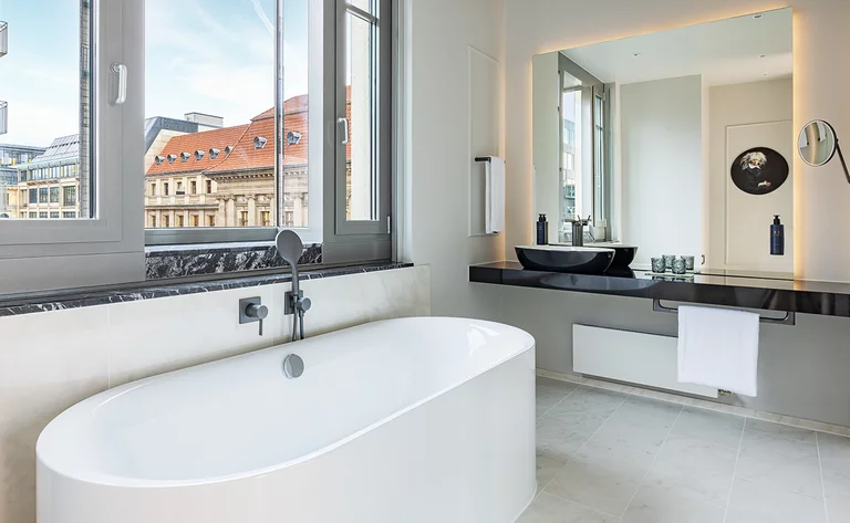 Chi entra nella spaziosa reception del Westin Grand di Francoforte si lascia alle spalle il trambusto del vicino quartiere bancario: sedute di gusto e luci calde diffondono un'atmosfera familiare. Ma cosa rende l'hotel appena rinnovato un rifugio urbano? La decisione di installare dodici vasche da bagno BetteLux Oval Silhouette, che ora regalano piacevoli momenti di relax.