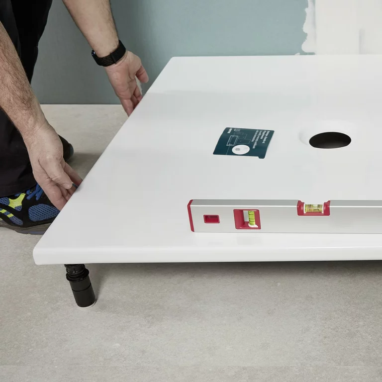 Chiunque sia in grado di regolare una panca pieghevole può ora livellare anche i piatti doccia: basta una livella.