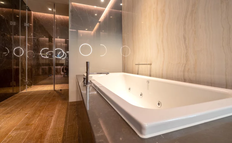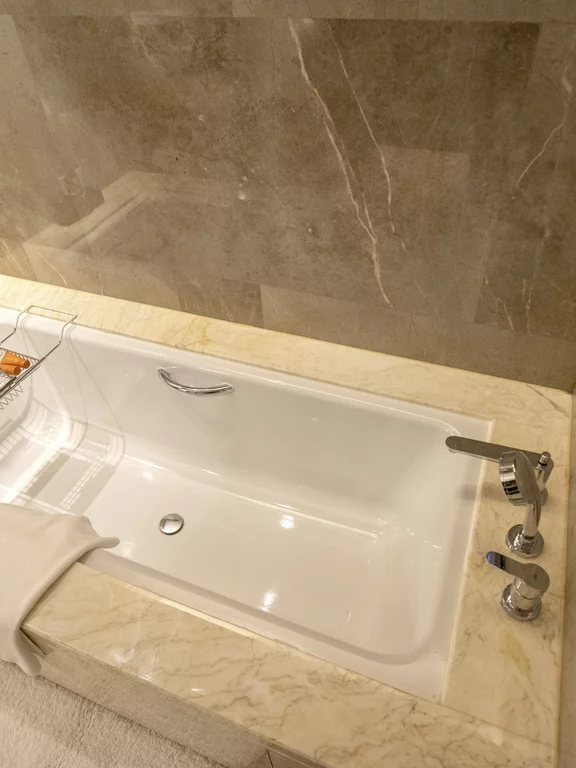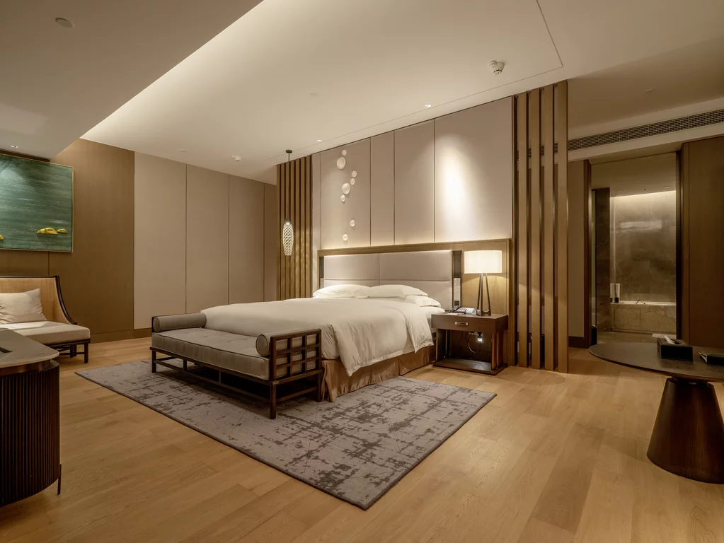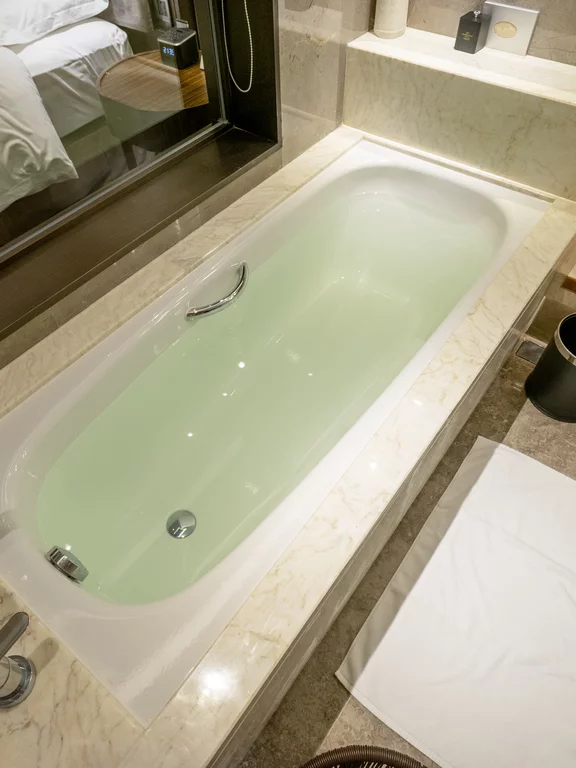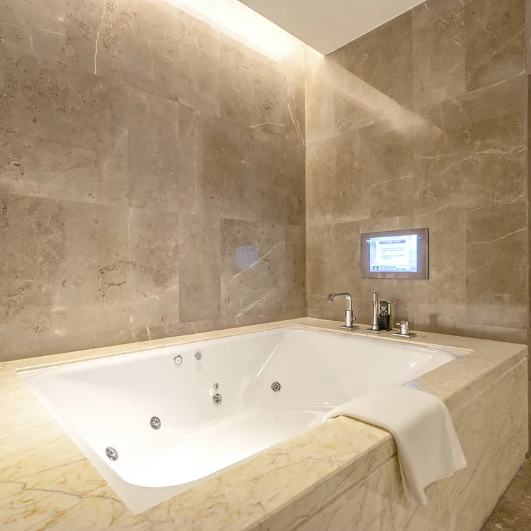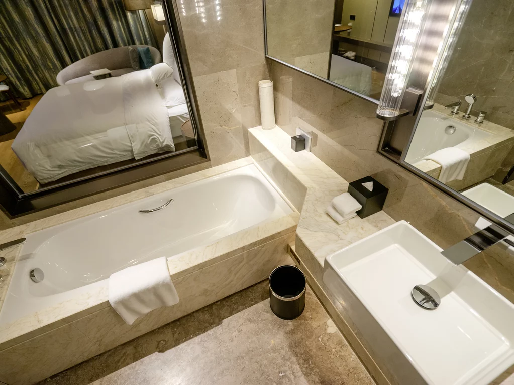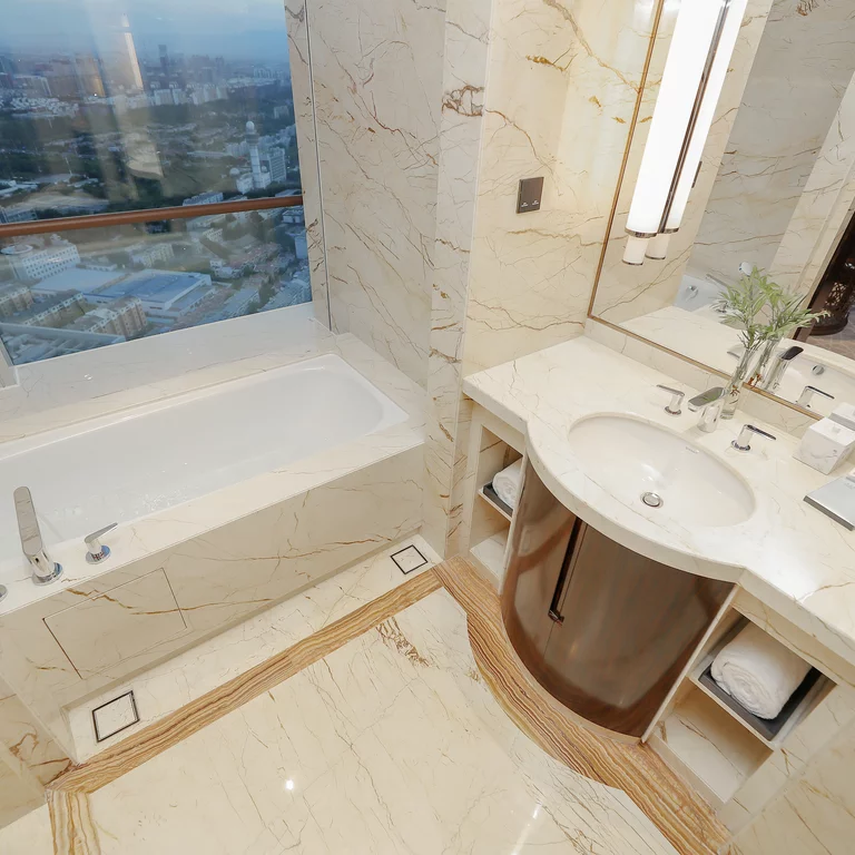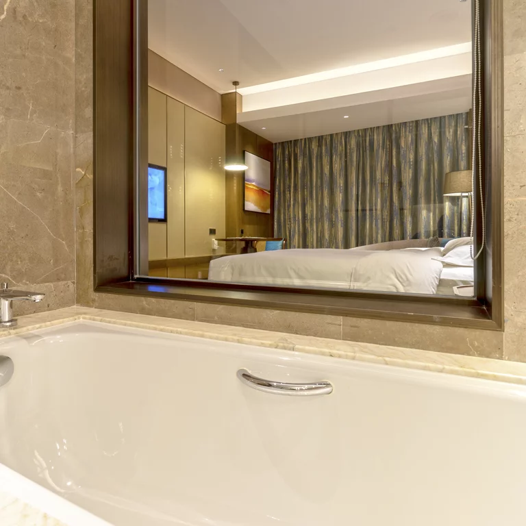 De elegant ontworpen badkamers bieden gasten een luxe en ontspannende ervaring. De badkamers zijn ontworpen in een moderne Aziatische stijl en voorzien van hoogwaardige uitrusting. U vindt er onder andere vrijstaande wastafels en baden met whirlpoolsystemen van ons bedrijf. Een ontspannende badervaring is dus gegarandeerd!