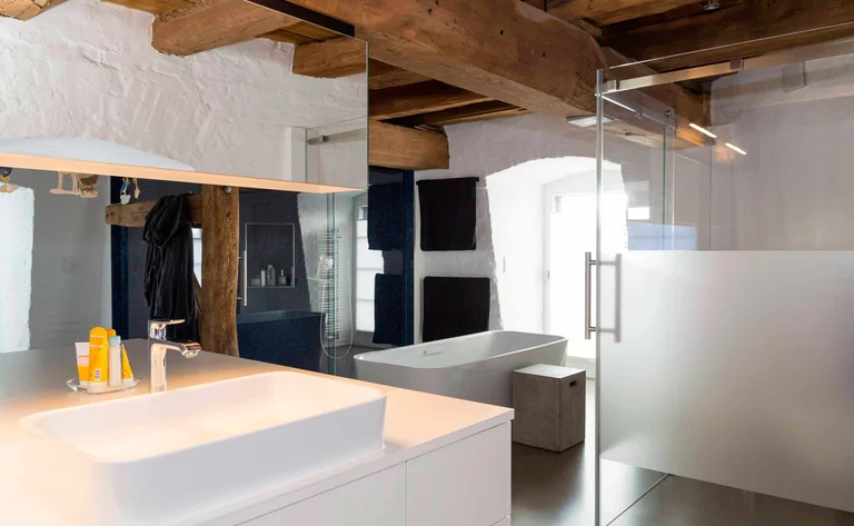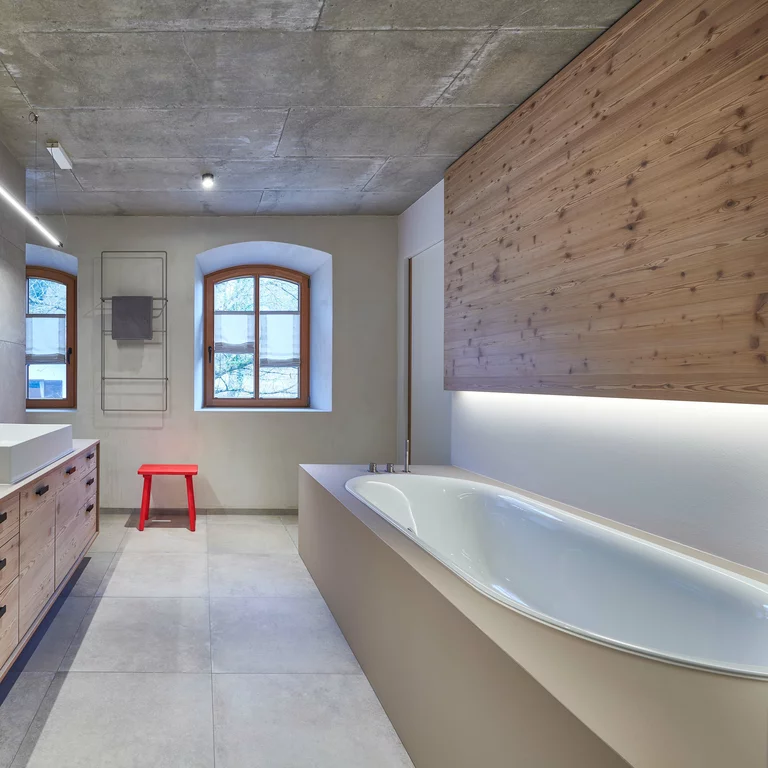 Волнующим моментом для архитекторов и мастеров был монтаж элементов для ванной ванны в заранее напечатанные конструкции. Однако им удалось без каких-либо проблем не только установить обе душевые панели BetteFloor на подготовленные места, но и идеально вписать овальную ванну BettePool в напечатанные из бетона закругленную стену дома и фартук ванны.