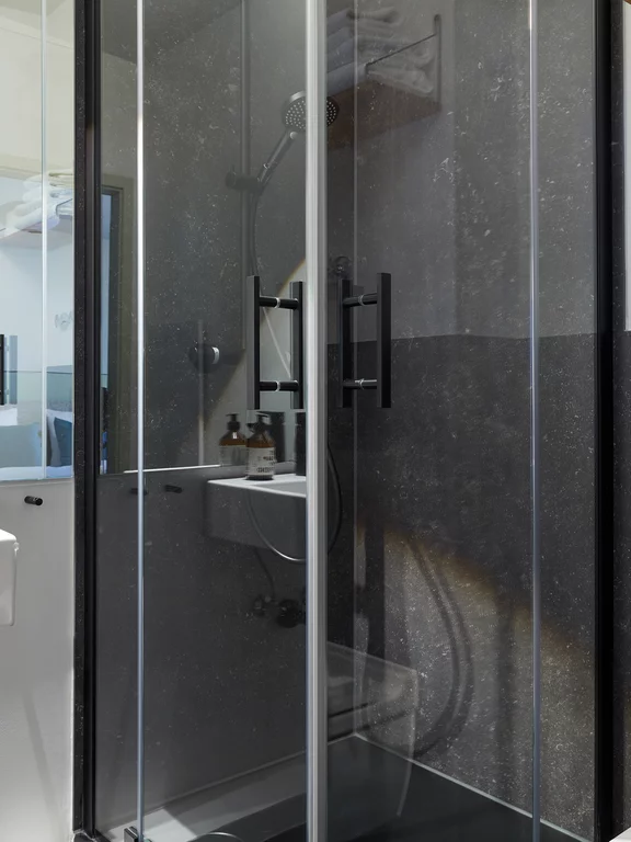 Ein weiteres ästhetisches Detail sind die Ablaufdeckel in der gewählten Farbe der Duschwanne, die flächenbündig mit der Standfläche abschließen und so für eine durchgängige und homogene Optik und ein angenehmes Begehgefühl unter der Dusche sorgen. Apropos: Die Duschwannen in der Farbe Flint ließ das Hotel zusätzlich mit dem rutschhemmenden Antirutsch Pro von Bette veredeln, um hier höchste Steh- und Gehsicherheit gemäß DIN 51097 (Bewertungsklasse B) und DIN 51130 (Bewertungsklasse R10) für seine Gäste zu gewährleisten. Die Ästhetik der mattfarbenen Glasur bleibt dabei makellos erhalten.