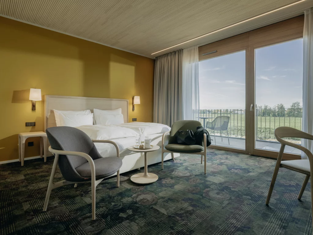 Die 64 Gästezimmer des Hotels sind hochwertig, komfortabel und modern eingerichtet und mit jeweils 34 Quadratmetern sehr geräumig. Auch im Innenbereich wird auf die Verwendung nachwachsender Rohstoffe geachtet und ein Farbkonzept mit natürlichen Tönen in Braun, Beige, Grün und Blau betont den ökologischen Ansatz. Die Gäste haben vielfältige Möglichkeiten sich in der Anlage und im Park zu entspannen und profitieren von den Freizeitangeboten der Region. Zudem verfügen alle Zimmer über einen acht Quadratmeter großen Balkon mit Aussicht auf den Schwarzwald oder die Parkanlage.