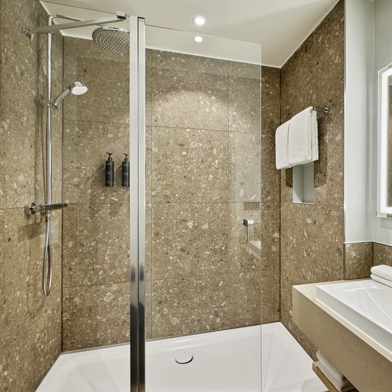 在费尔德贝格宫酒店(Hotel Feldberger Hof)只有一种时光:家庭时光。酒店坐落在海拔 1300 米的费尔德贝格山(Feldberg)上,拥有适合家庭入住的基础设施,可为所有客人(无论老少)提供适合其年龄的设施,让他们在上黑森林度过一个特别而难忘的假期。这家四星级酒店共有 450 张床位,客房布局多种多样。由于工程必须快速进行,我们决定采用带有 BetteAntiSlip Sense 隐形防滑表面的 BetteUltra 淋浴盘,该淋浴盘可通过创新的 BetteLevel 系统支脚快速安装。